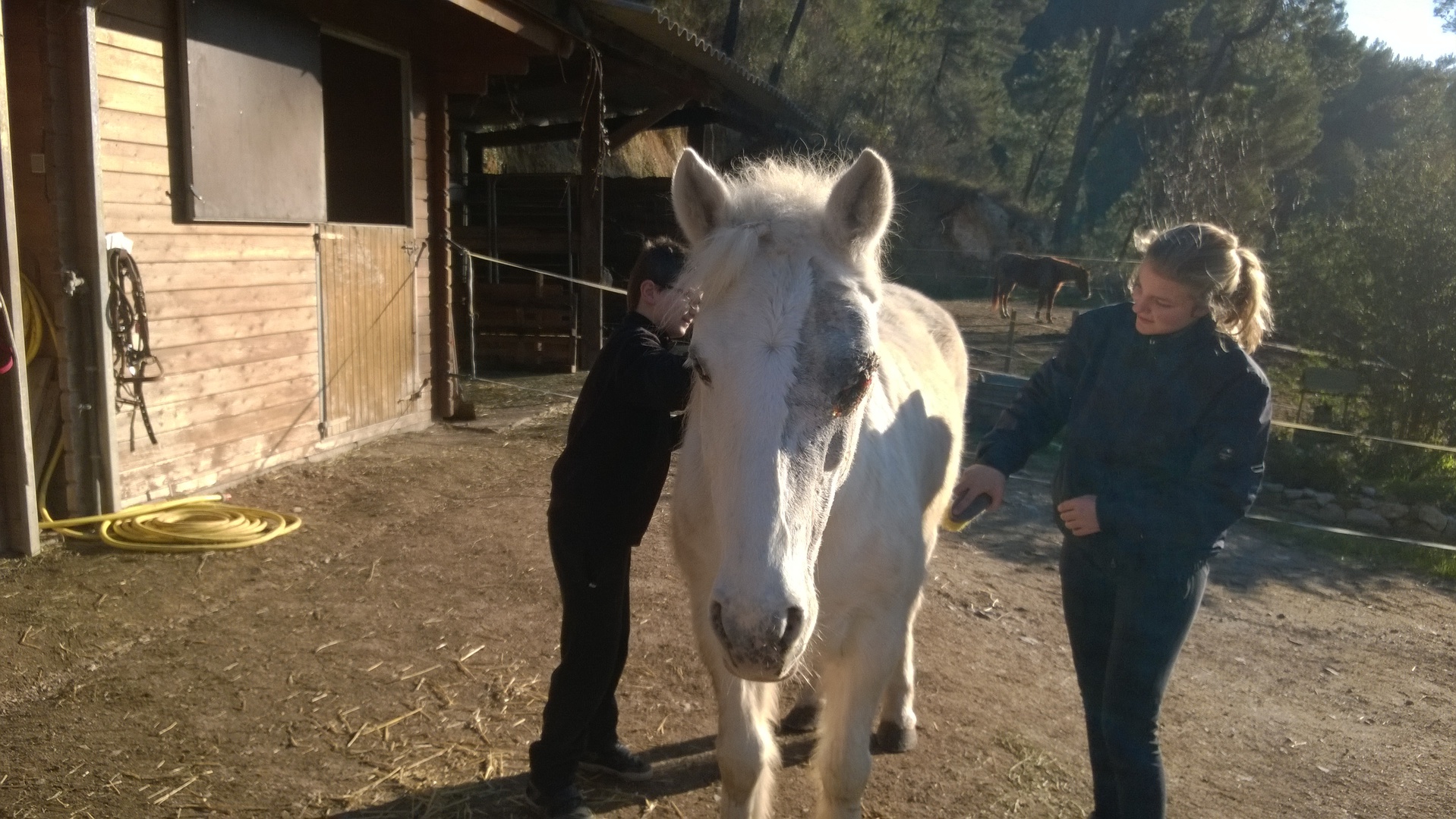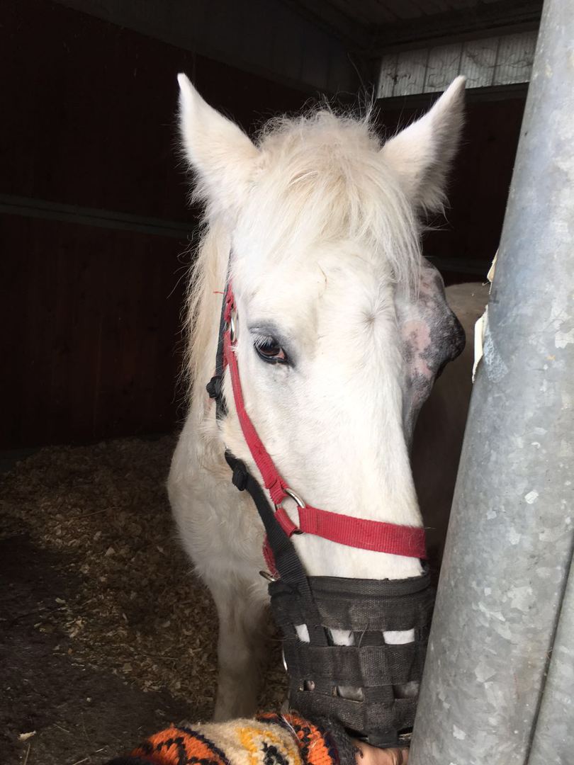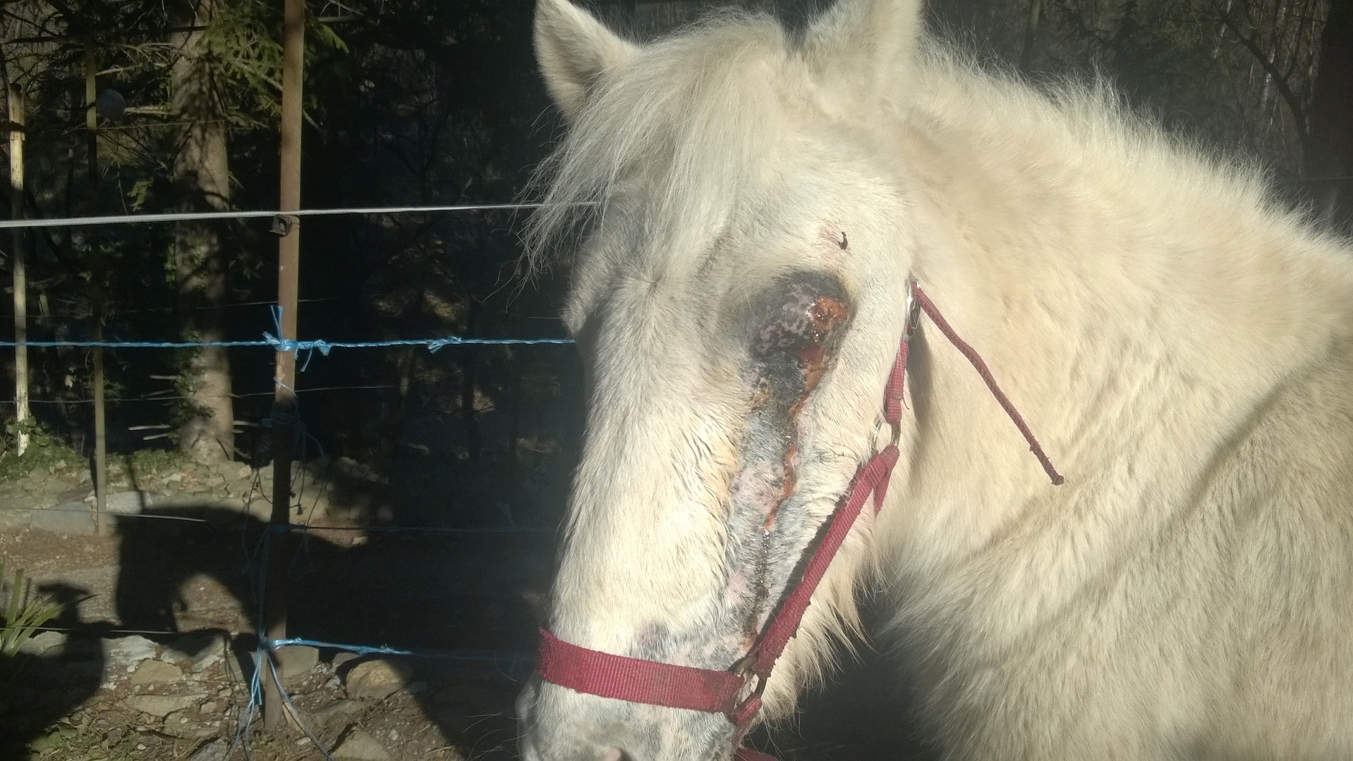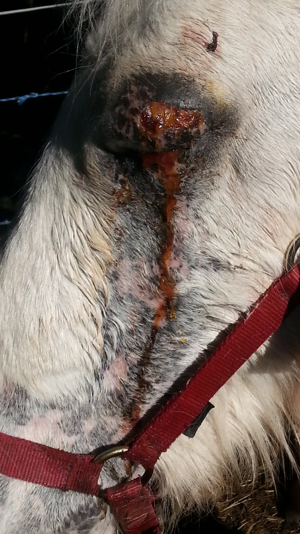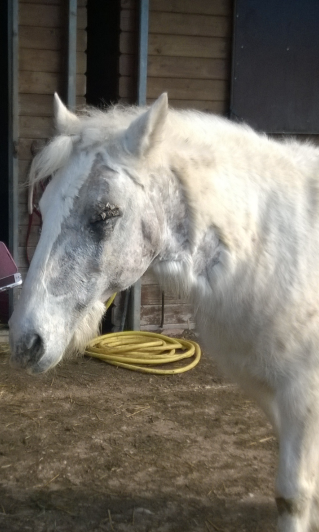 Suite à une erreur de diagnostique d'un vétérinaire qui ne fait pas partit de la Clinique équine de notre région il souffre depuis plusieurs mois car un corps étranger c'est loger entre ces 2 Paupières.