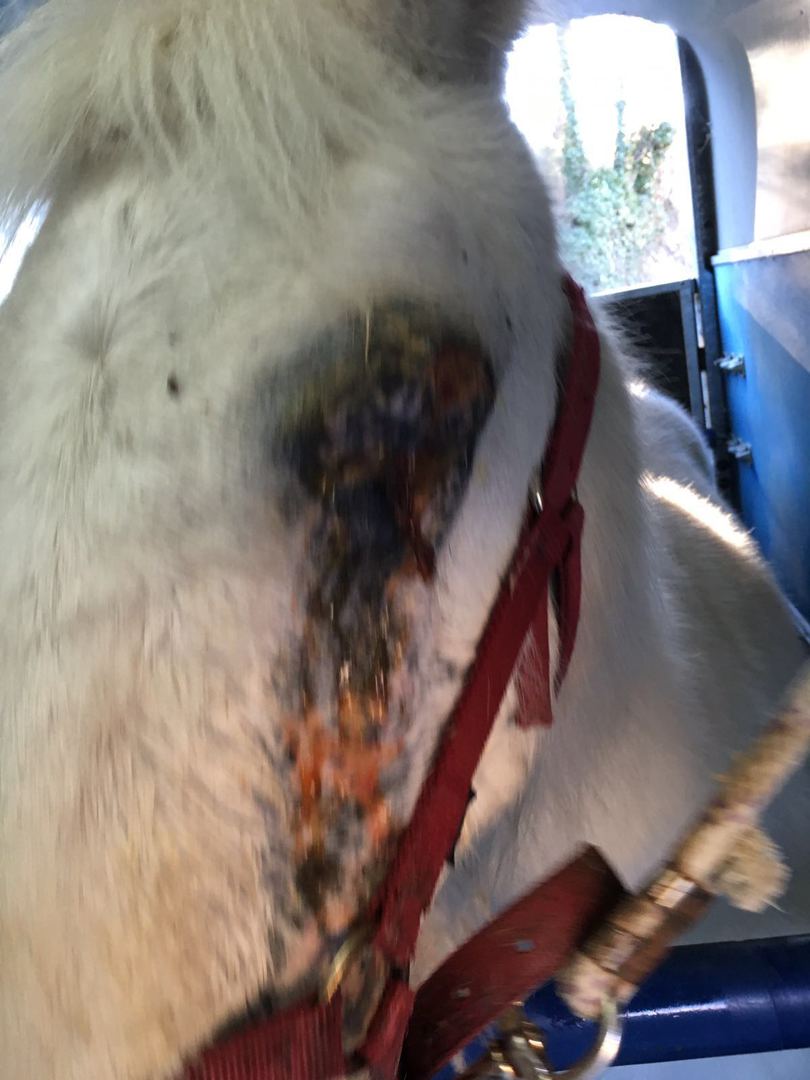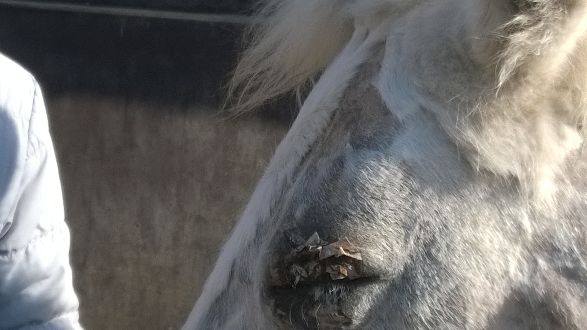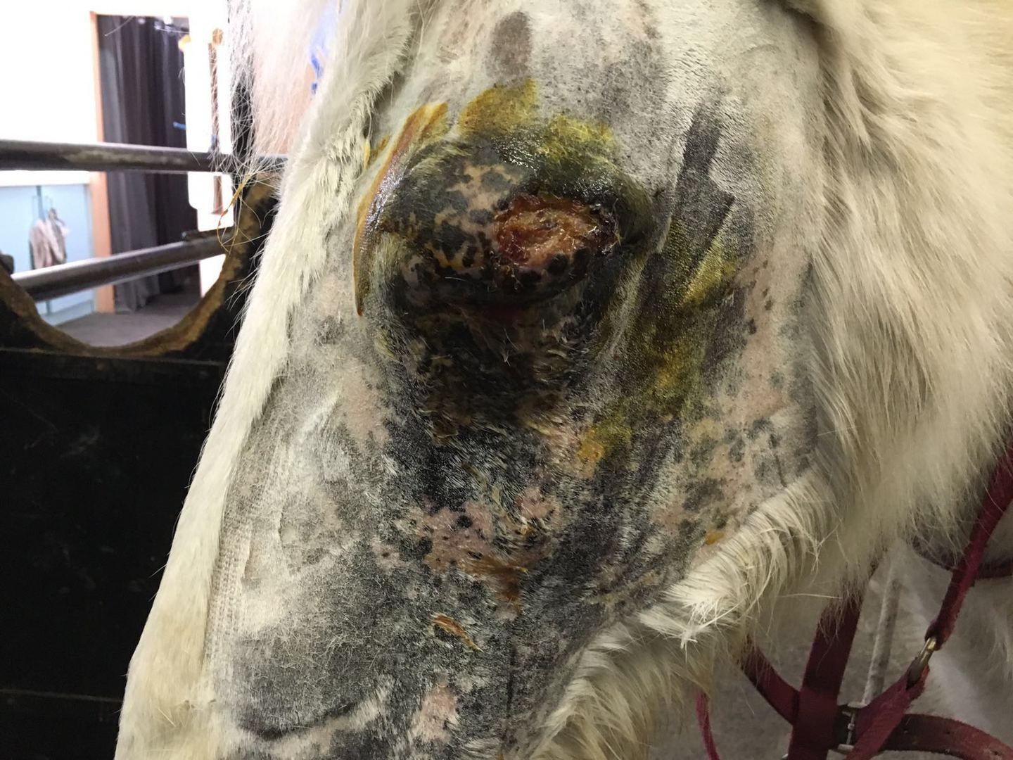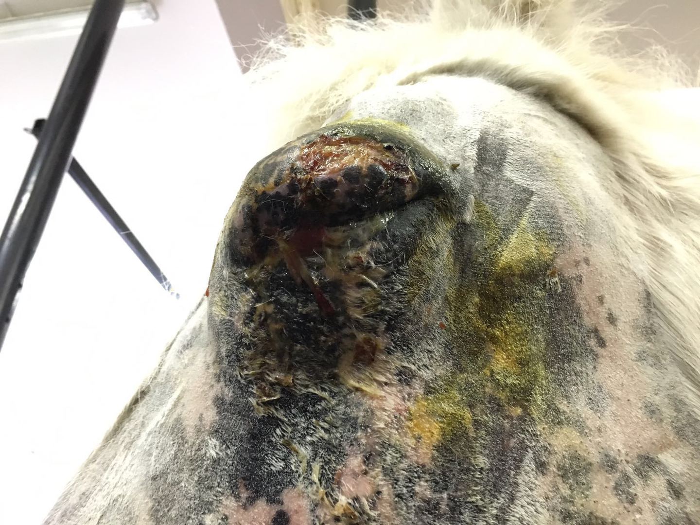 Suite à une erreur de diagnostique d'un vétérinaire qui ne fait pas partit de la Clinique équine de notre région il souffre depuis plusieurs mois car un corps étranger c'est loger entre ces 2 Paupières.