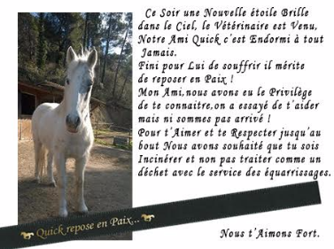 Mes Amis c'est le coeur noué et rempli de larmes que je Vous donne des nouvelles du résultat de sa Biopsie. Quick souffre d'un Cancer trés rare de la Paupiére aucun traitement n'est possible rien ne peut être fait! Trop injuste! Ils semblerait que son cas ne soit jamais arriver dans le monde Equin et que seulement 1 cas sur 1000 pourrait être diagnostiqué chez les Humains. Que doit-on faire? Il faut malheureusement prendre une décision qui me brise le Coeur car il ne peut pas vivre ainsi! Il risquerais de souffrir et de Mourir par éttouffement car la masse qui se trouve dans sa Tête vas continuer de grossir et vas finir par attrofier son Larynx! Sans oublier que ce Cancer est propagatif et que d'autres masse vont se loger dans son corps qui lui se bat pour Vivre! Gentil Quick qui nous donne temps d'Amour et de Reconnaissance qui a rempli nos Coeur de sa Tendresse et qui n'a pas le droit de Vivre... Tous ensemble nous avons essayer de t'aider en te fesant soigner et résultat la Vie en a décider autrement. Ces un Cri de Douleur qu'il y a dans mon Coeur Injuste Nul et méprisable tu n'a que 11 ans, Tu est Adorable, et nous nous devons te Tuer car tu ne peut vivre ainsi alors que tu mérite de Vivre! Comme Nous ne savons pas quand il faut agir pour Lui éviter de souffrir, nous avons demander au Véto de passer le voir pour nous dire d'aprés lui s'il souffre ou pas! Il doit venir ces jours ci je vous tiendrez au courants.... Merci à vous Tous pour l'aide et le Soutien que vous Lui avait Apporter on a essayer mais malheureusement la Vie en a décider autrement Bisous à Vous Tous.