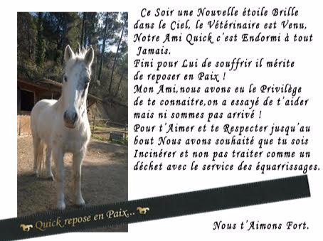 Bonjour,Le bilan d'hier pour Quick n'est pas très favorable car le Véto hier soir nous a dit qu’après examen l’œil est un problème mais pas le seul car il a dû Pu dans toute la tête qui a endommagé certains canaux et le plus grave c'est qu'il a la poche du Larynx gorgé de Pu! C'est sûr il ne sortiras pas dans 48 h car aujourd'hui il opère et dans quelque jours il lui ferons des lavements pour essayer de vider cette poche du Larynx. Intervention très délicate… Le véto dit que rien n'est perdu mais rien n'est gagner et il faudra des mois de traitements et de convalescence si tout se passe bien. Le Pauvre sa me déchire le Cœur quand on croise sa route et que l’on partage même 5 mn avec Lui on craque tellement Il est tendre et Gentil, c'est un Amour de Poney. Je croise les doigts j'ai très peur de l'appel des Vètos ce matin après l'opération... Mais il faut rester confiant et lui envoyer pleins de Positif... Merci à Tout ceux qui le soutienne dans son combat. Je vous tiens au courant dès que j’ai des News.