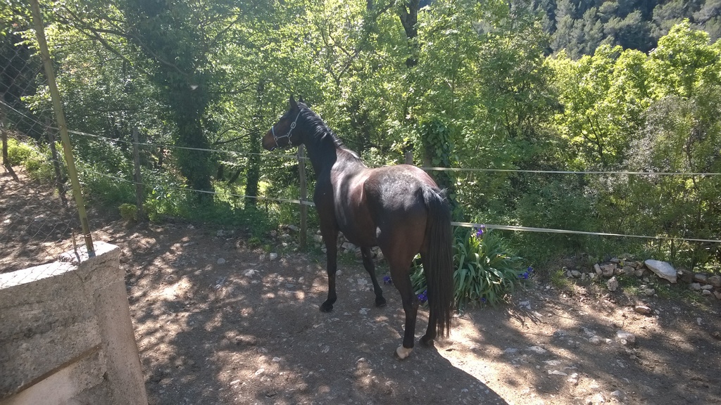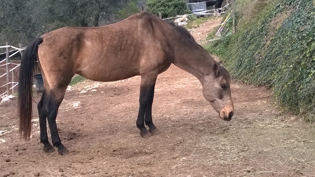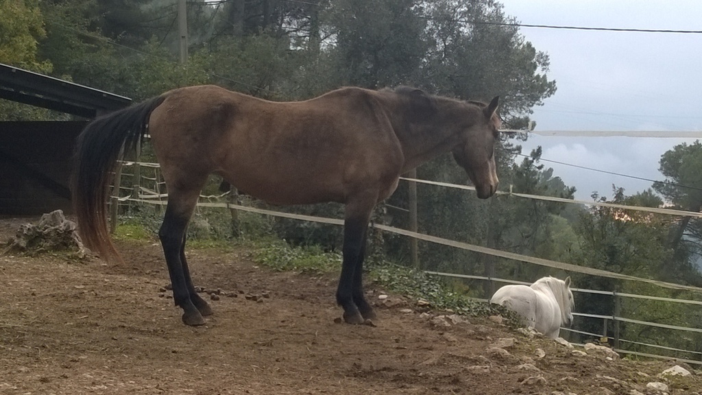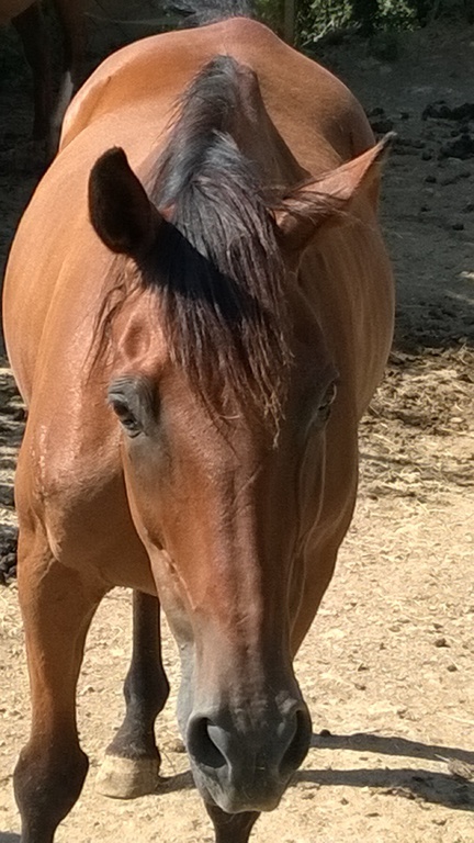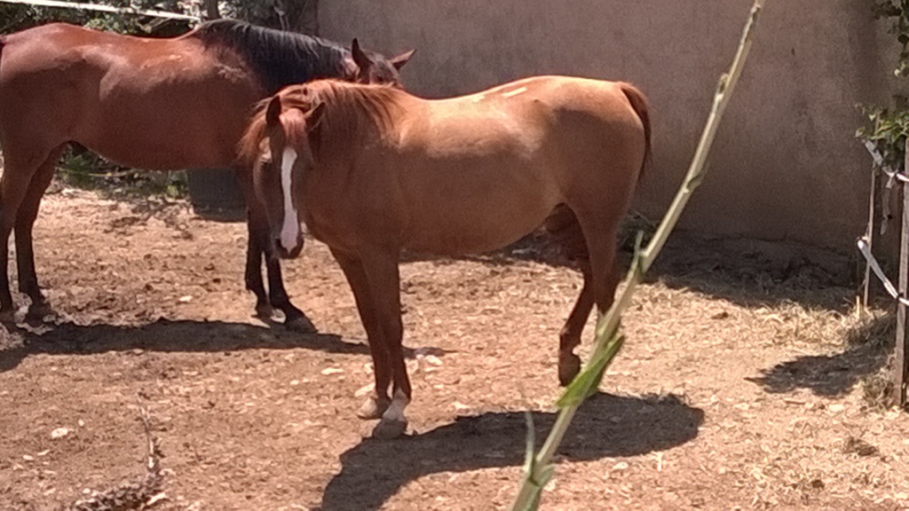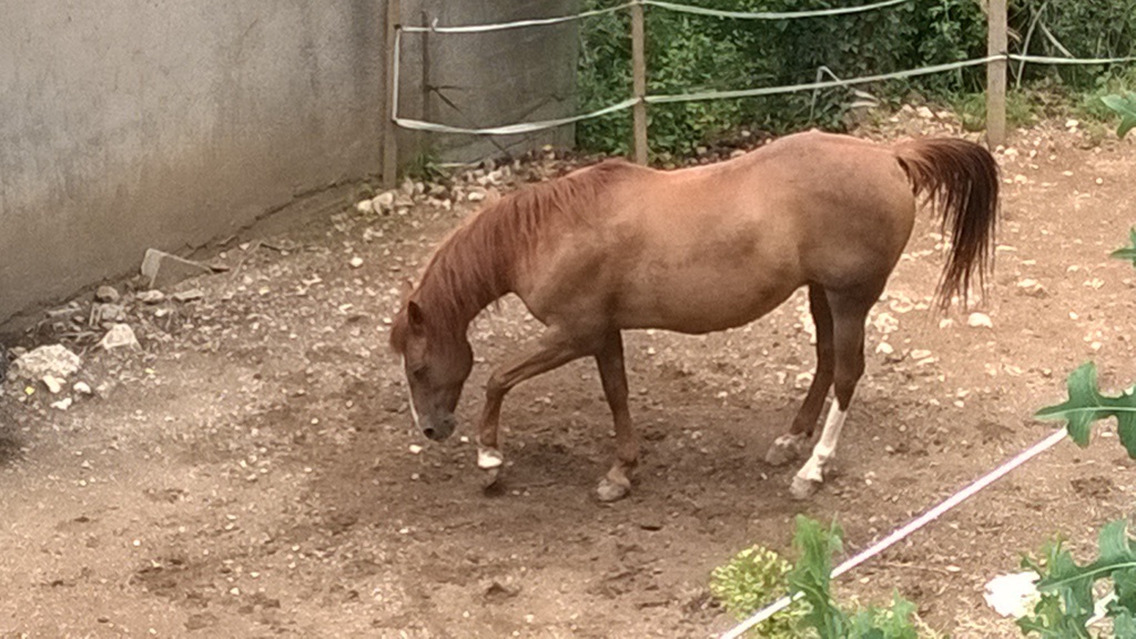 Cette Jument OI Quater croisée Arabe agée de 13 ans a été rachetée à sa Propriétaire pour Lui éviter le Marchand de Chevaux et par la Même,empêcher son Copain Médi de partir au Couteau.